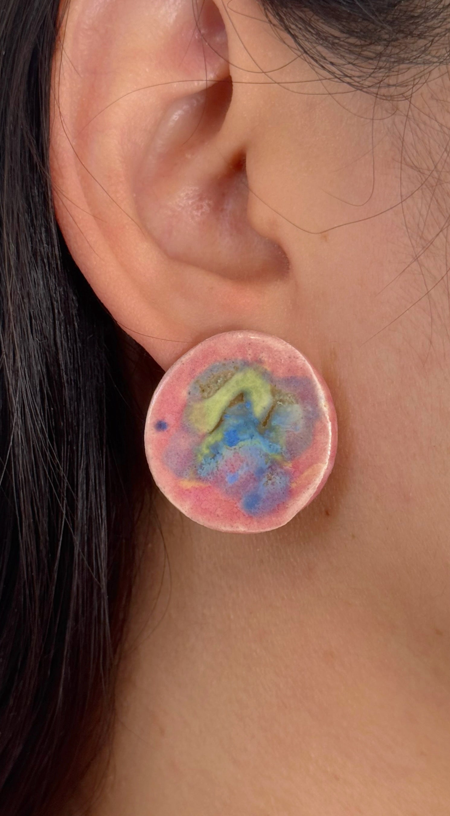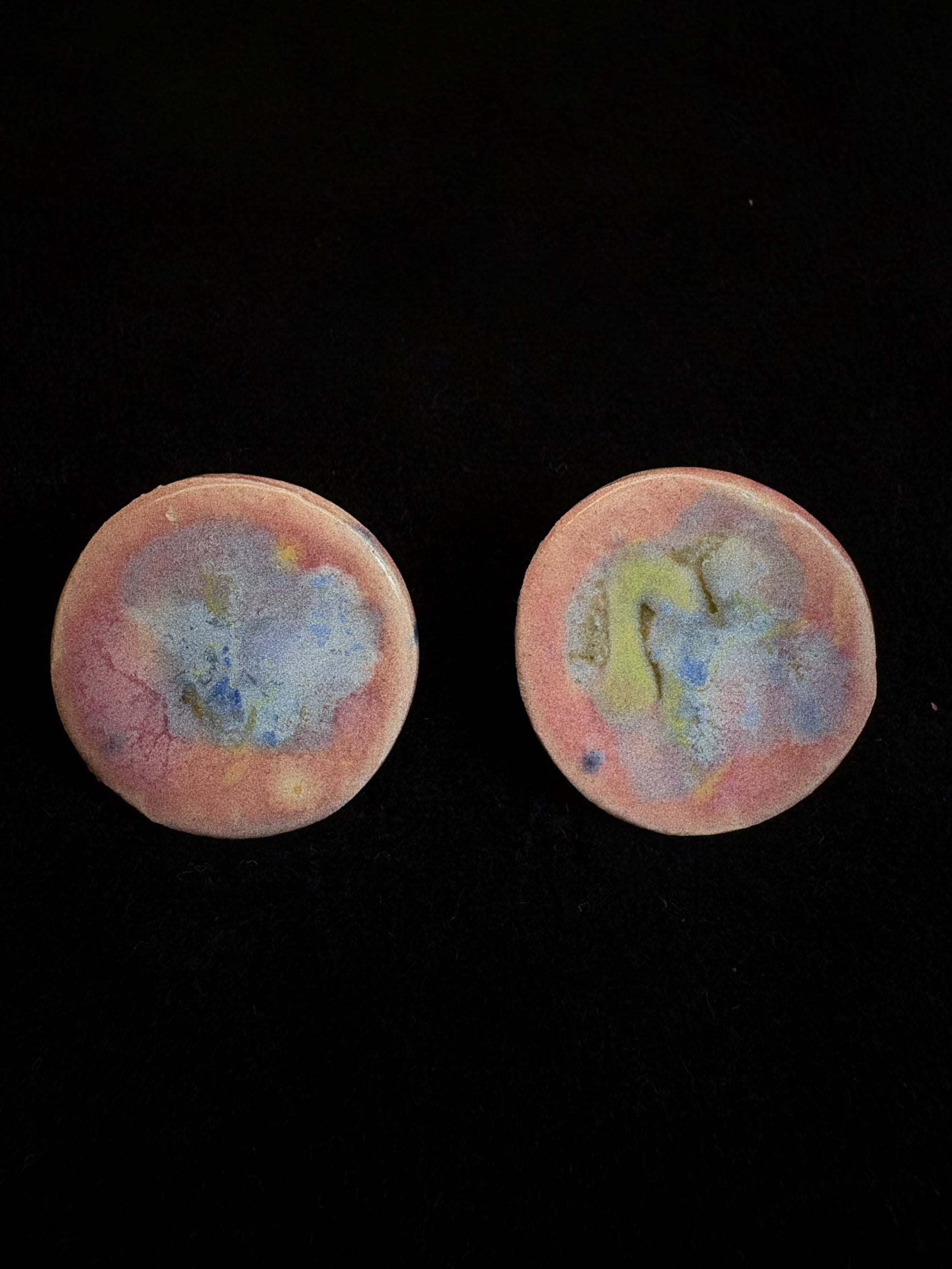 Leuchtende Glasurschichten bilden organische Punkte, Wolken und mikroskopische Landschaften – jedes Stück ein spontanes Farbexperiment und ein echtes Unikat.